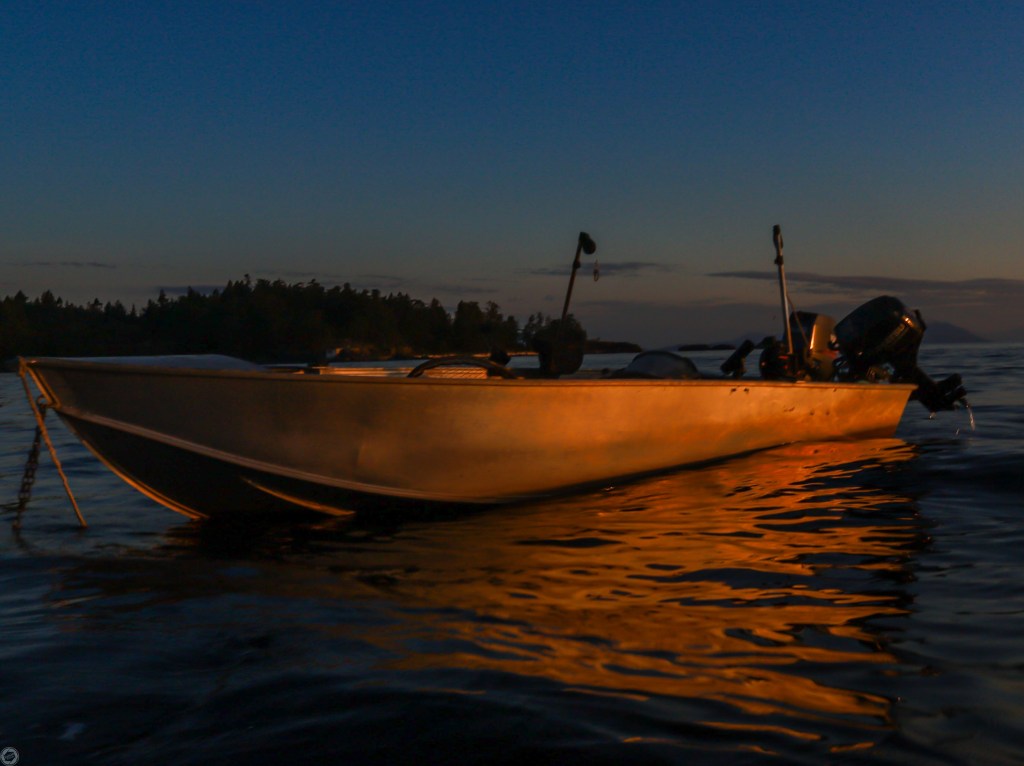 My morning view at 5am. The tree silhouette is part of Pipers Lagoon.Single fishing boat anchored 40 feet from Shack Island. Looking west onto Shack Island. Water became more turbulent from this side. Shack Island. When the tide is out, you can walk to this island from Pipers Lagoon. This small aluminum boat looks copper from the morning sunrise. Bald eagle looking for his next meal. He was sitting on a small rock Island near Neck Point.